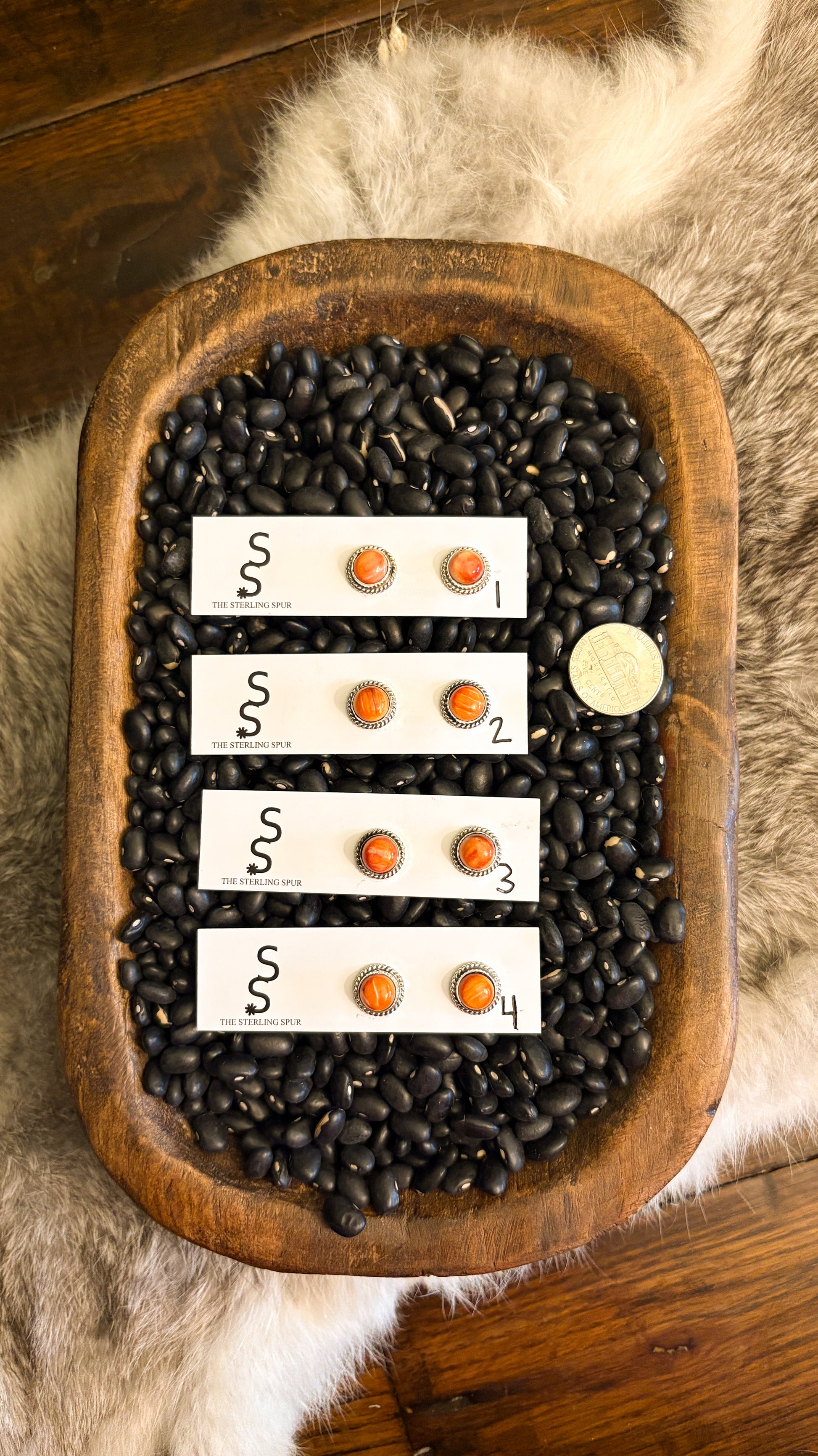 Carefully handcrafted by Navajo artist Esther White. Made with sterling silver & orange spiny oyster stones. Measure approximately 10mm in diameter. No stamp.