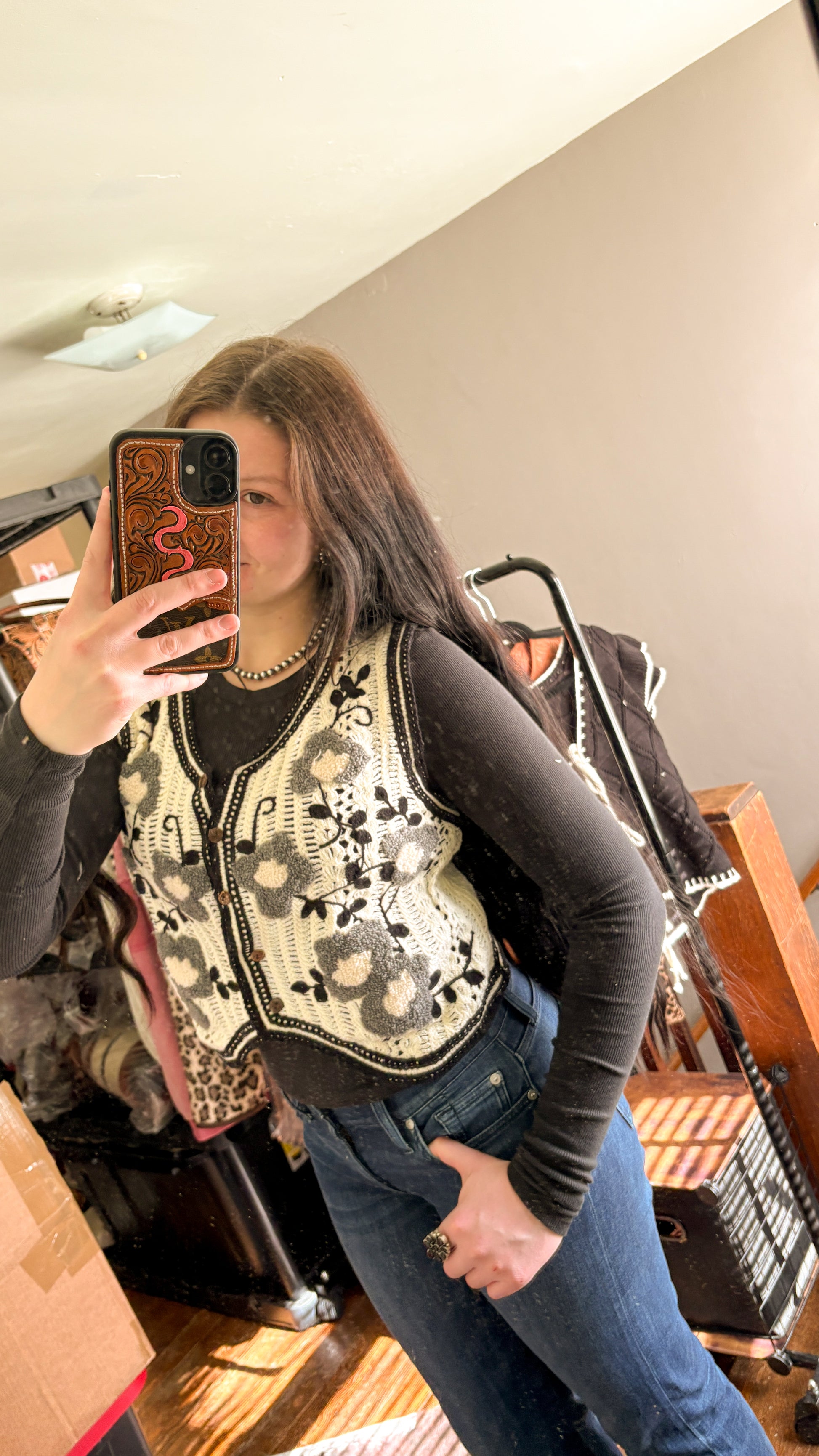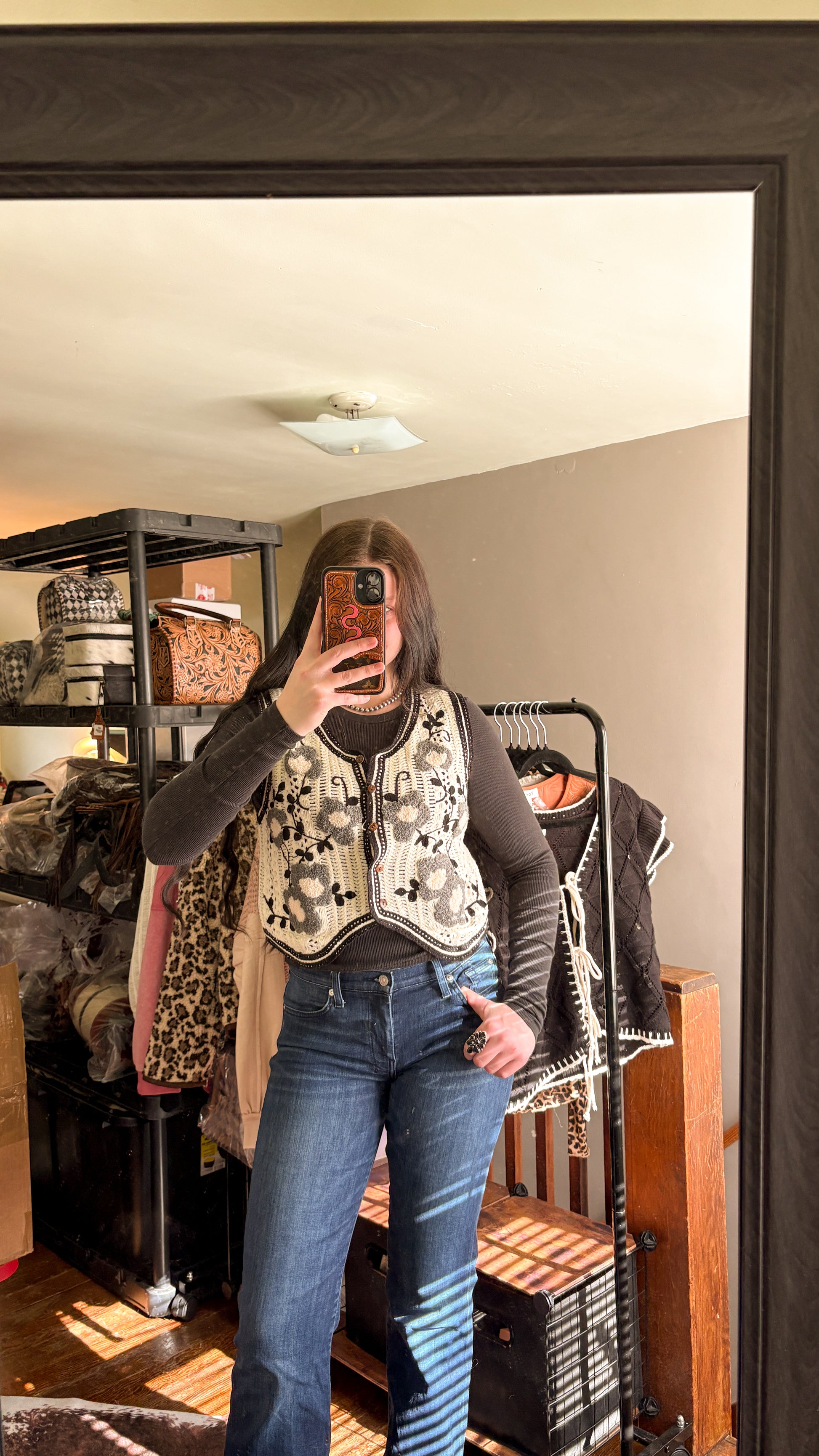 This vest pairs perfectly with a mock neck sleeve top underneath & a pair of dark wash jeans!