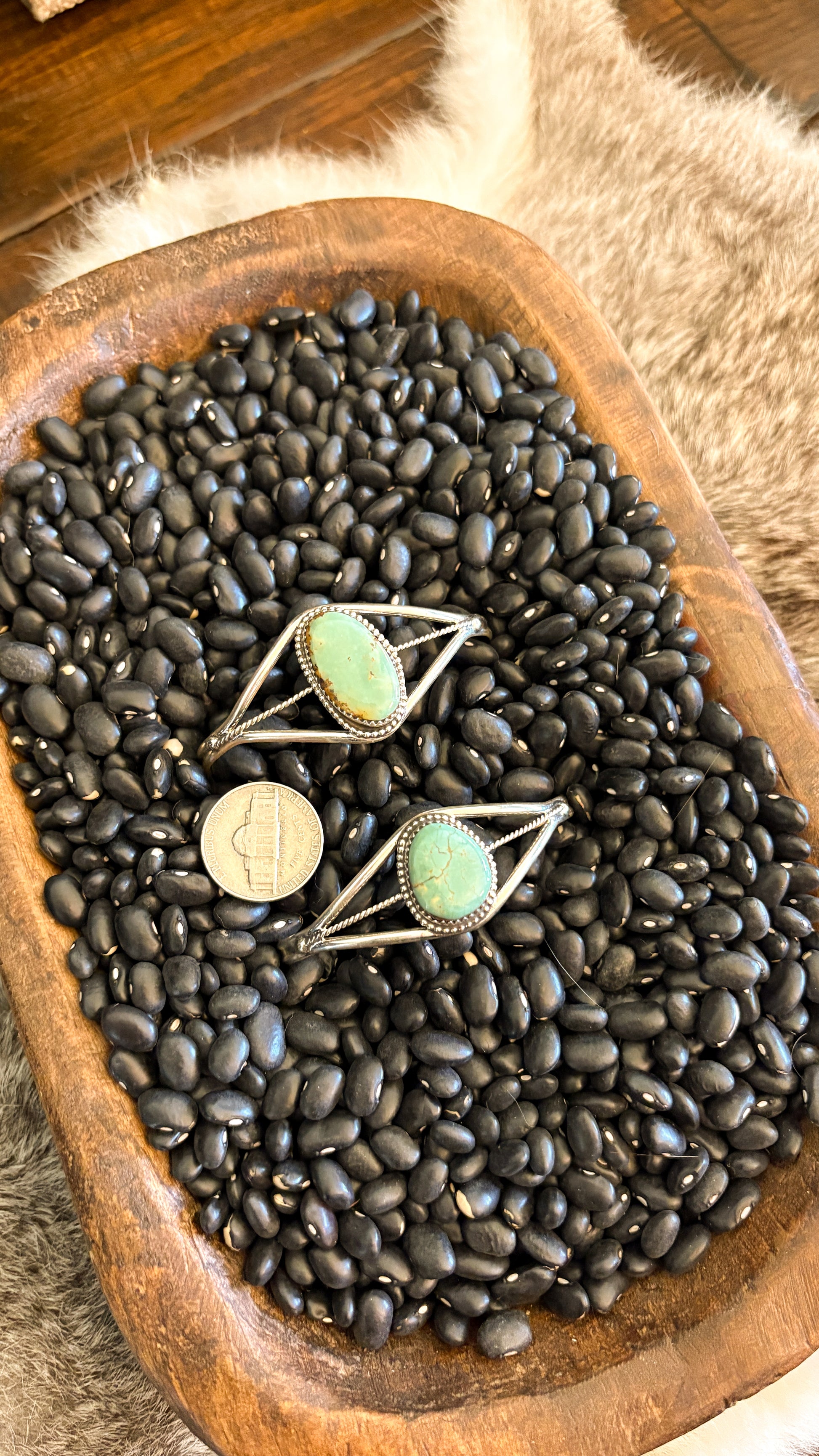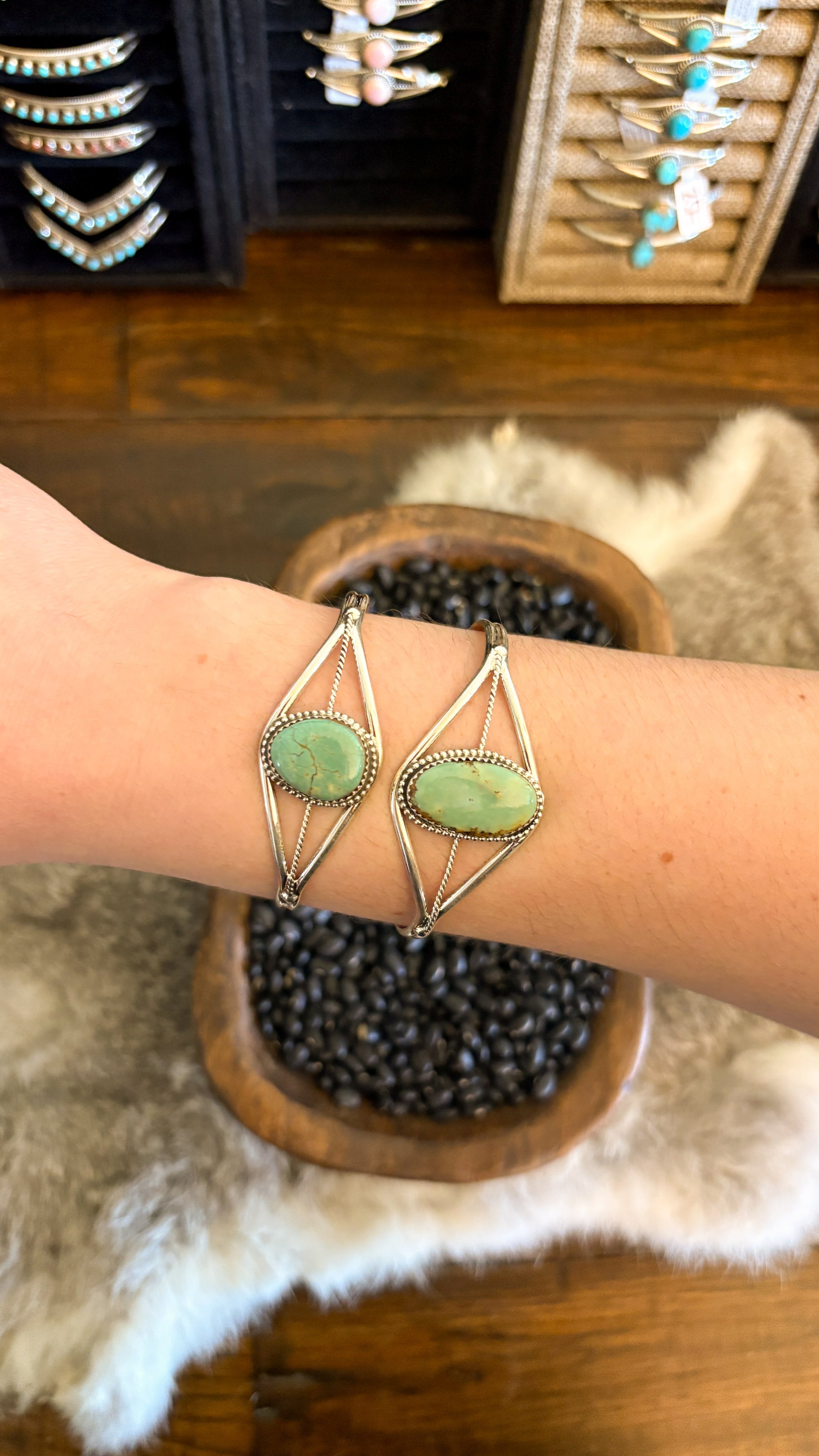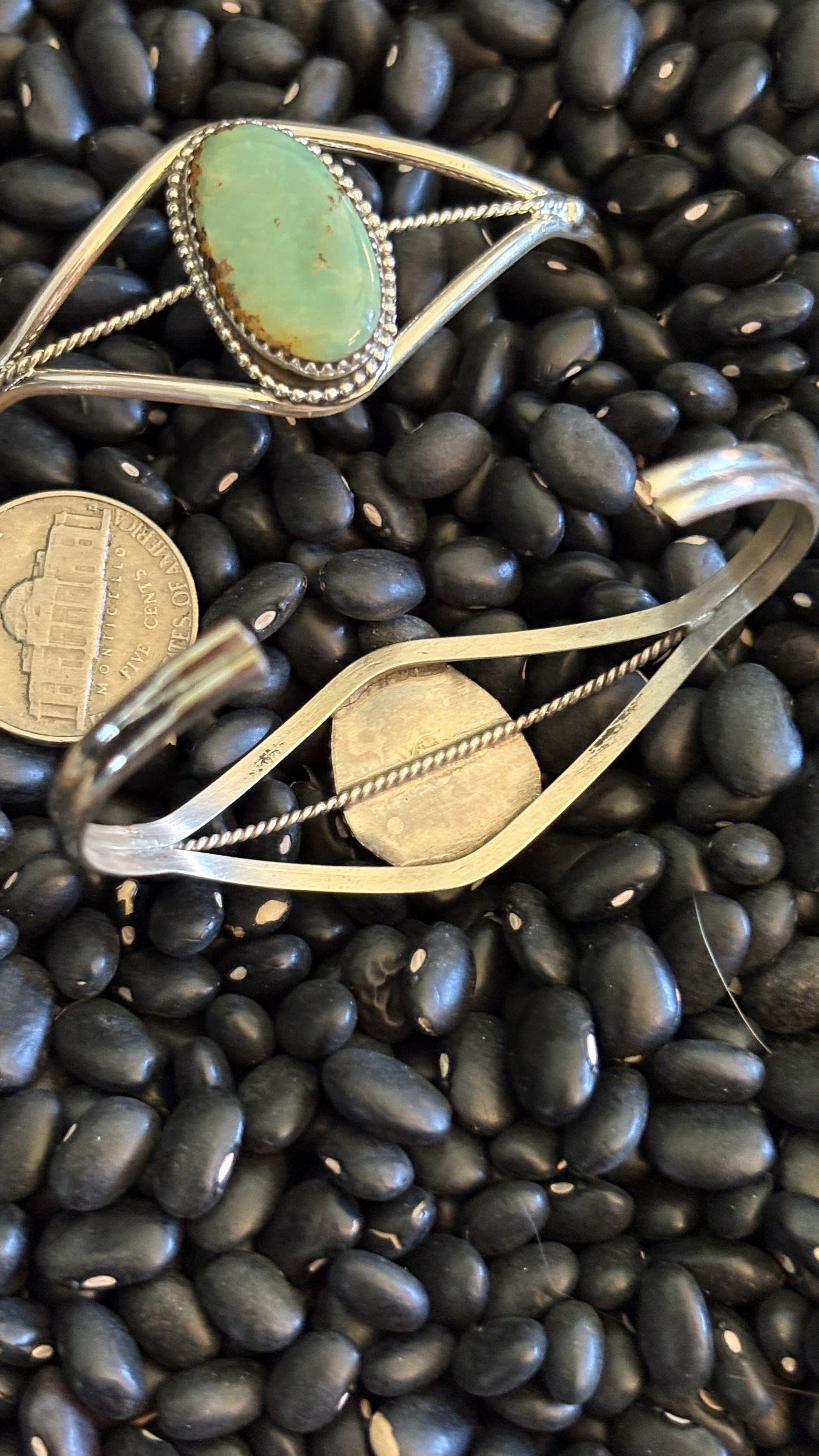 Handcrafted by Navajo artist Esther White with sterling silver & genuine turquoise stones. Each cuff sits at 6-1/4” & are very adjustable. Signed EW Sterling.