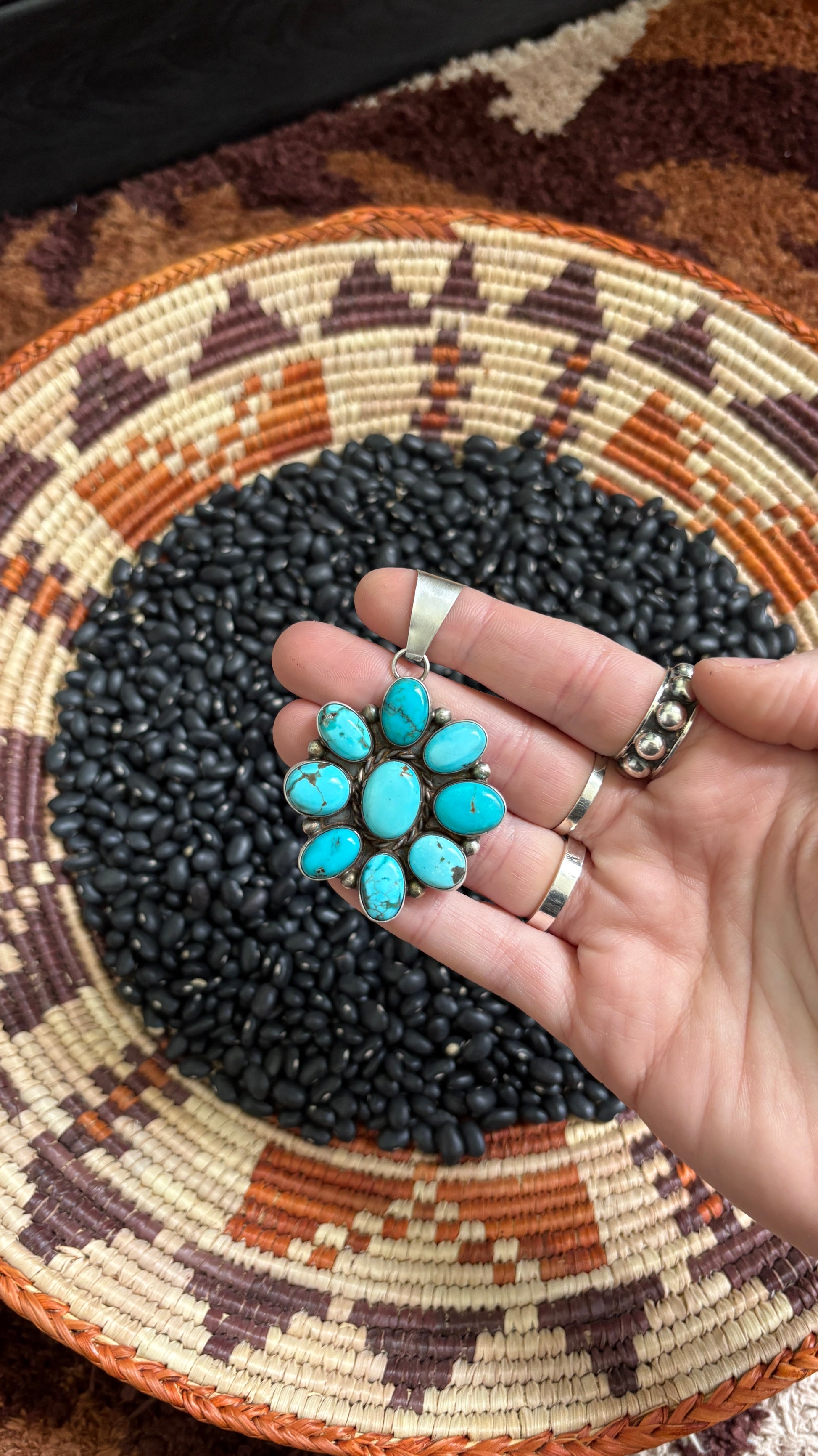 This gorgeous pendant was handcrafted by Native American artist Wilson Dawes with genuine Kingman turquoise stones & sterling silver.