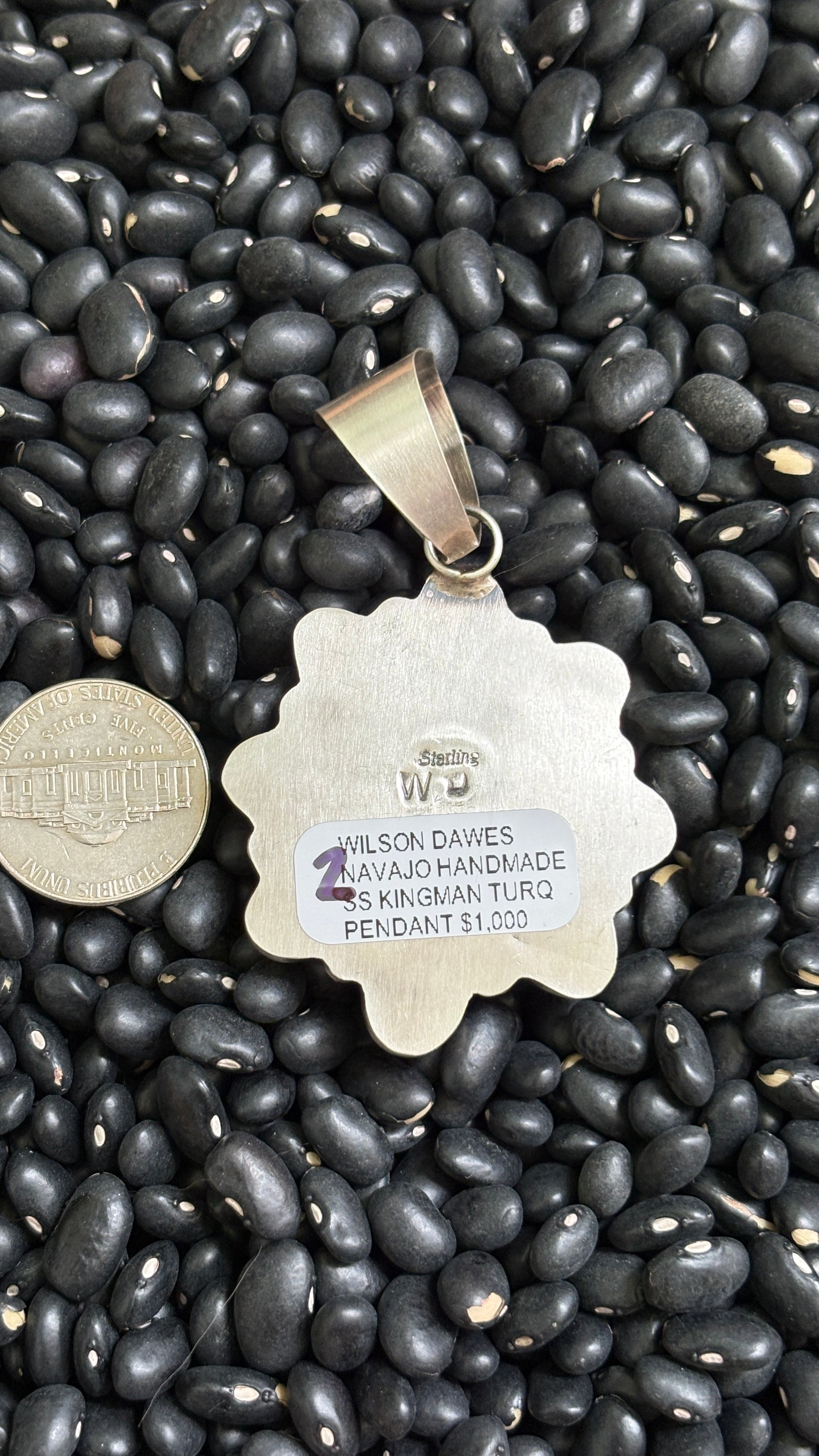 This gorgeous pendant was handcrafted by Native American artist Wilson Dawes with genuine Kingman turquoise stones & sterling silver.