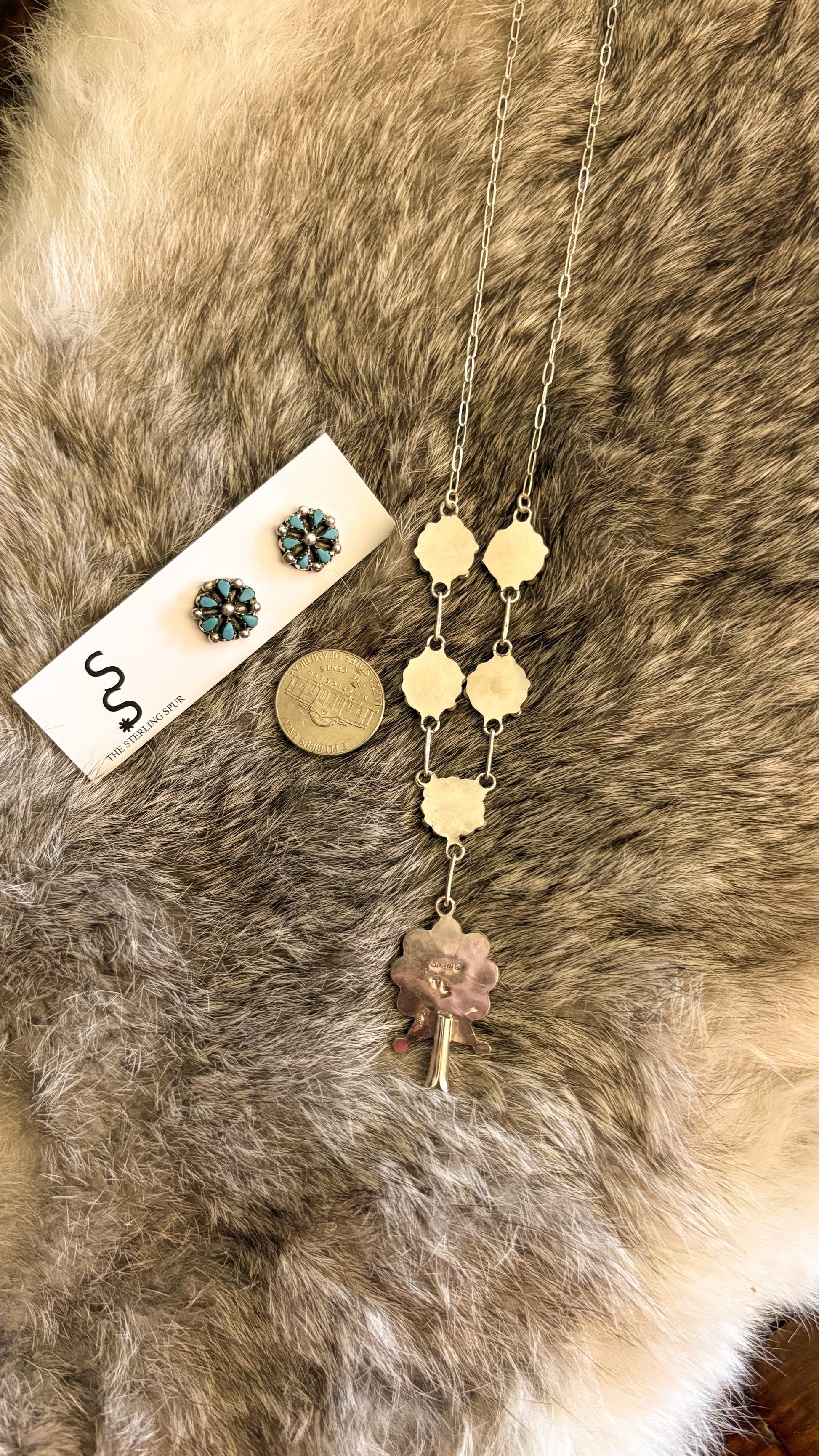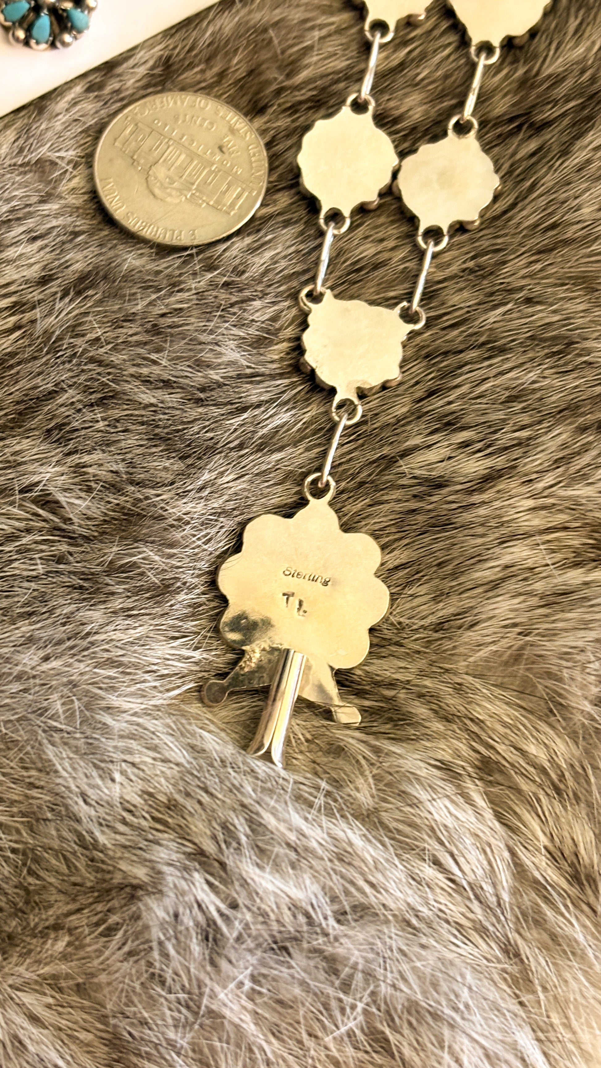 This gorgeous petit point turquoise set was handcrafted by Zuni artist Tricia Leekity. Made with sterling silver & genuine turquoise stones. This necklace measures 18.5” & the earrings measure 1/2” in diameter. Signed TL Sterling.