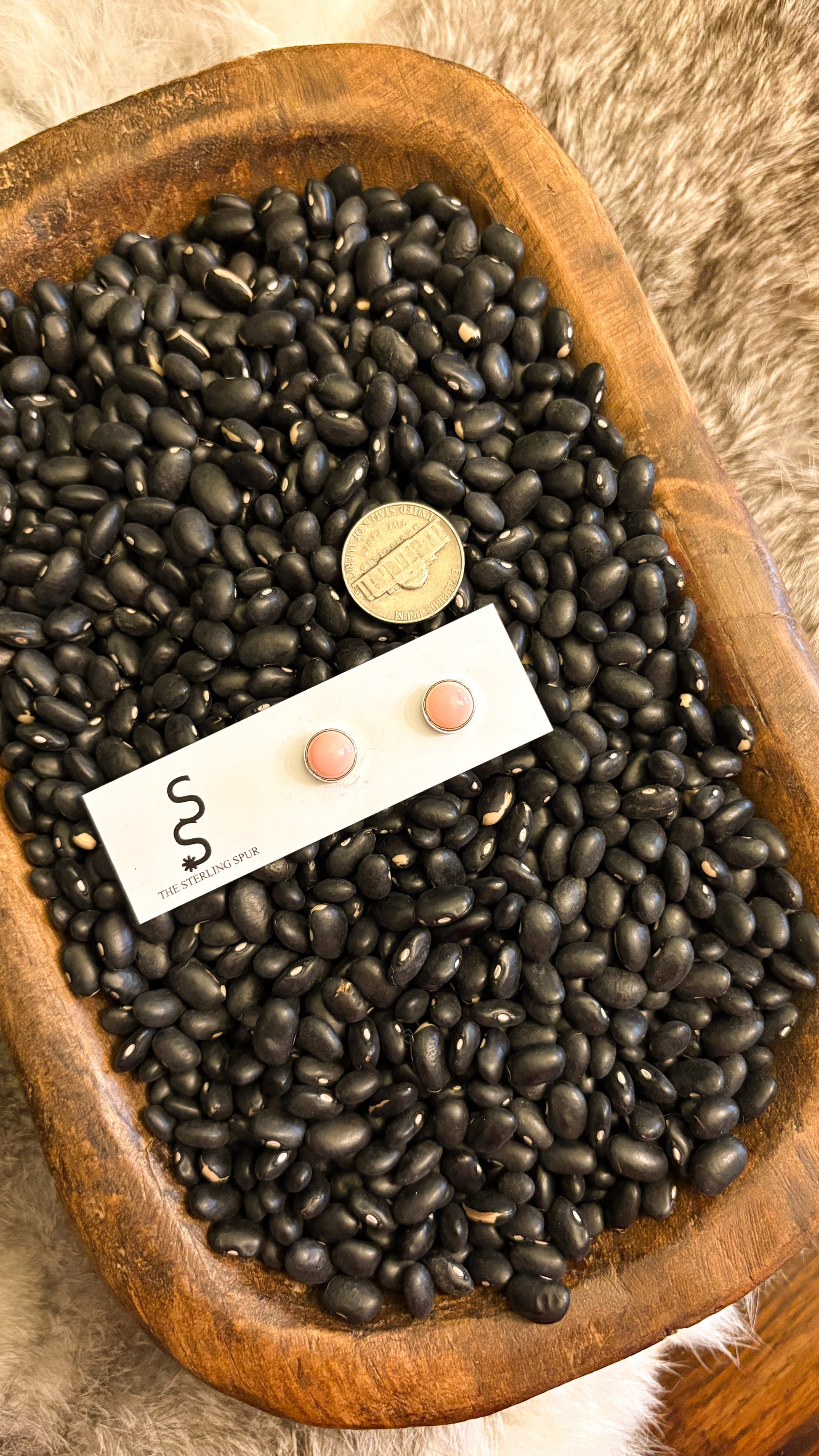 Handcrafted by Native American artists with sterling silver & genuine pink conch stones. Measure approximately 9mm in diameter. Stamped “Sterling”.