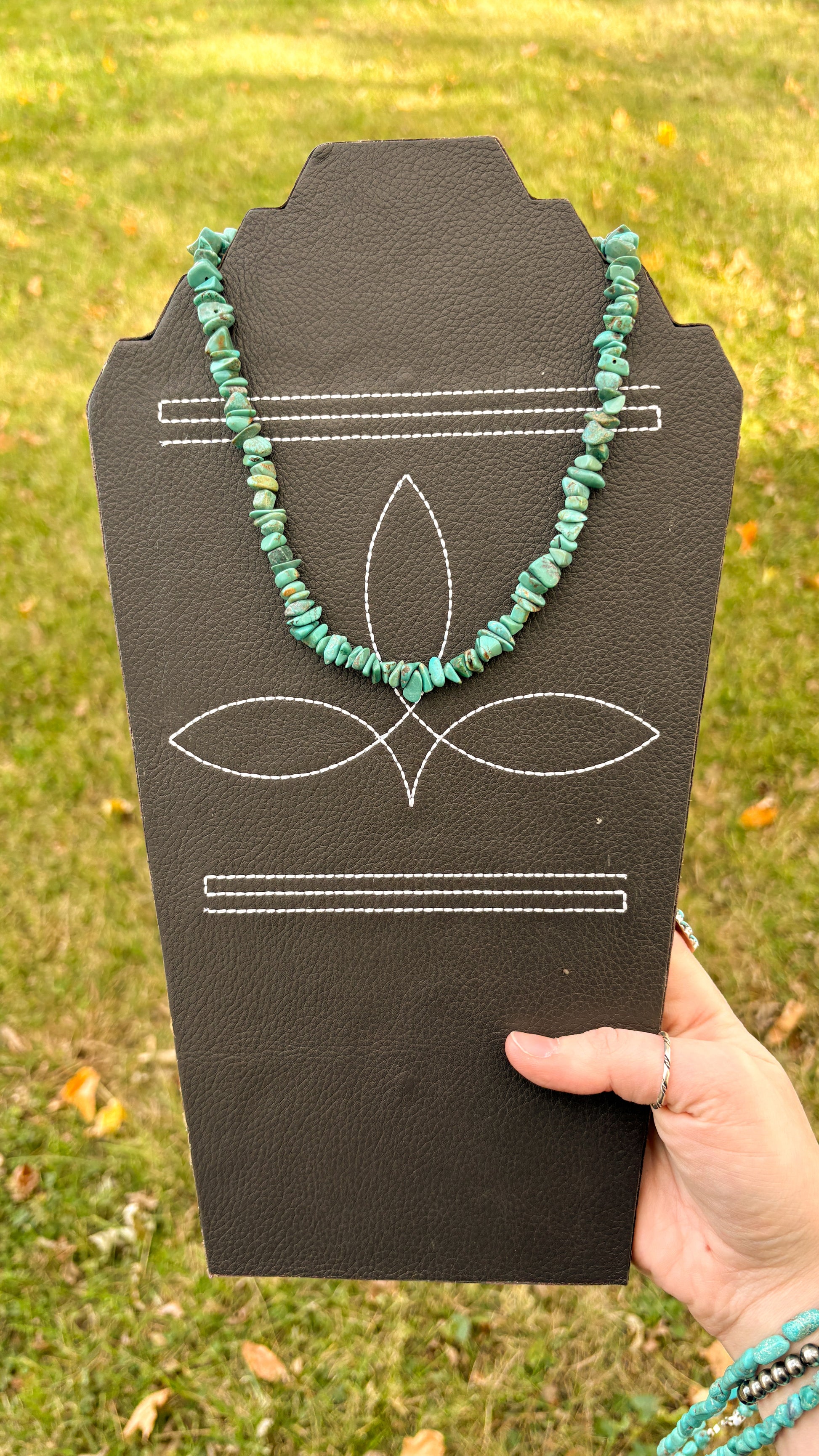 Multiple necklaces available. Each one is unique, as the turquoise chips are genuine & natural.