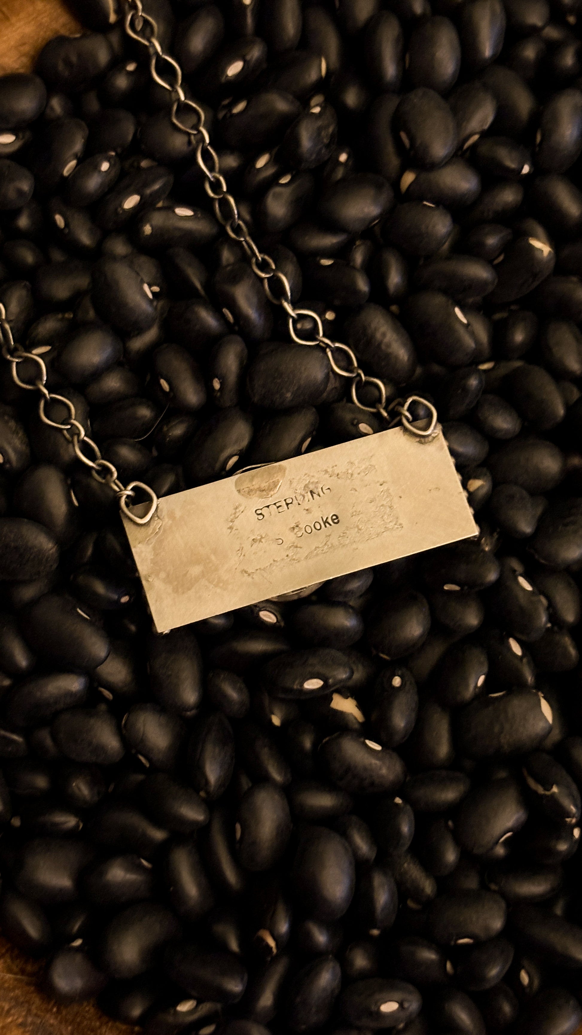19” chain with no extender. Plate measures 1-3/8” X 5/8”.