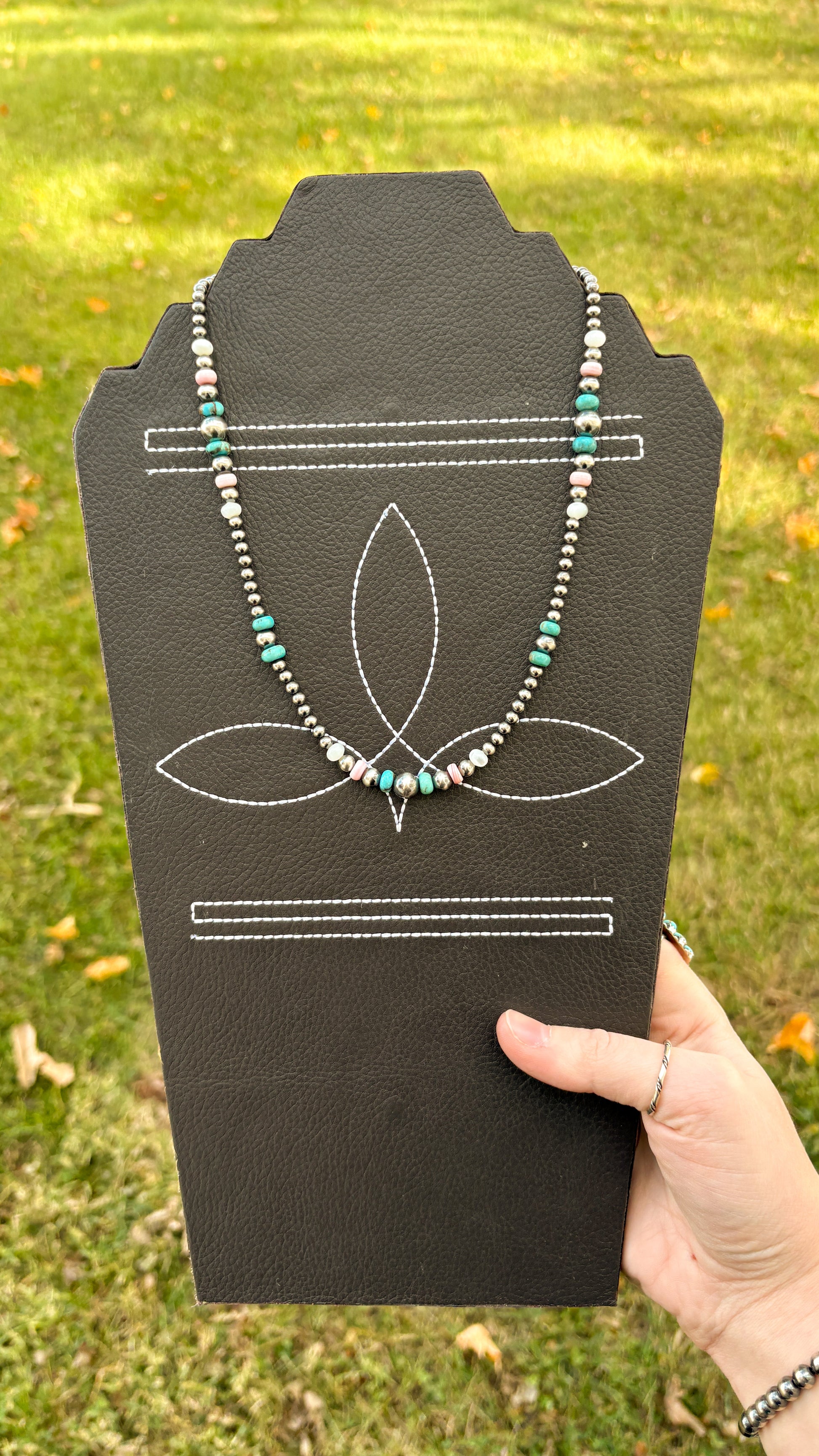 Sterling silver. Genuine turquoise, pink conch, and mother of pearl beads.