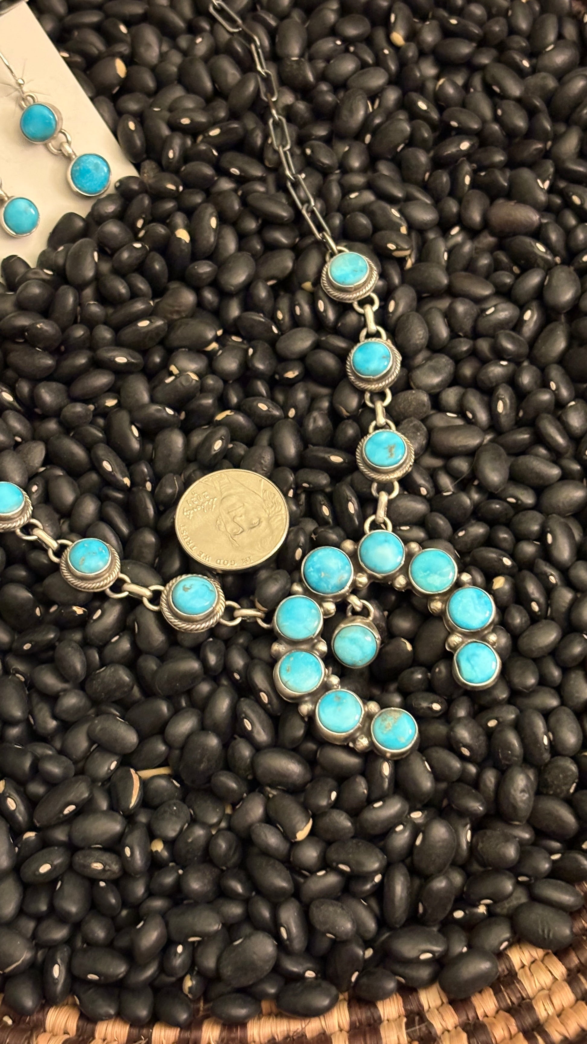 This gorgeous necklace was handcrafted by Native American artist Sharon Francisco with genuine turquoise stones & sterling silver. This necklace has a beautiful, oxidized paperclip chain.